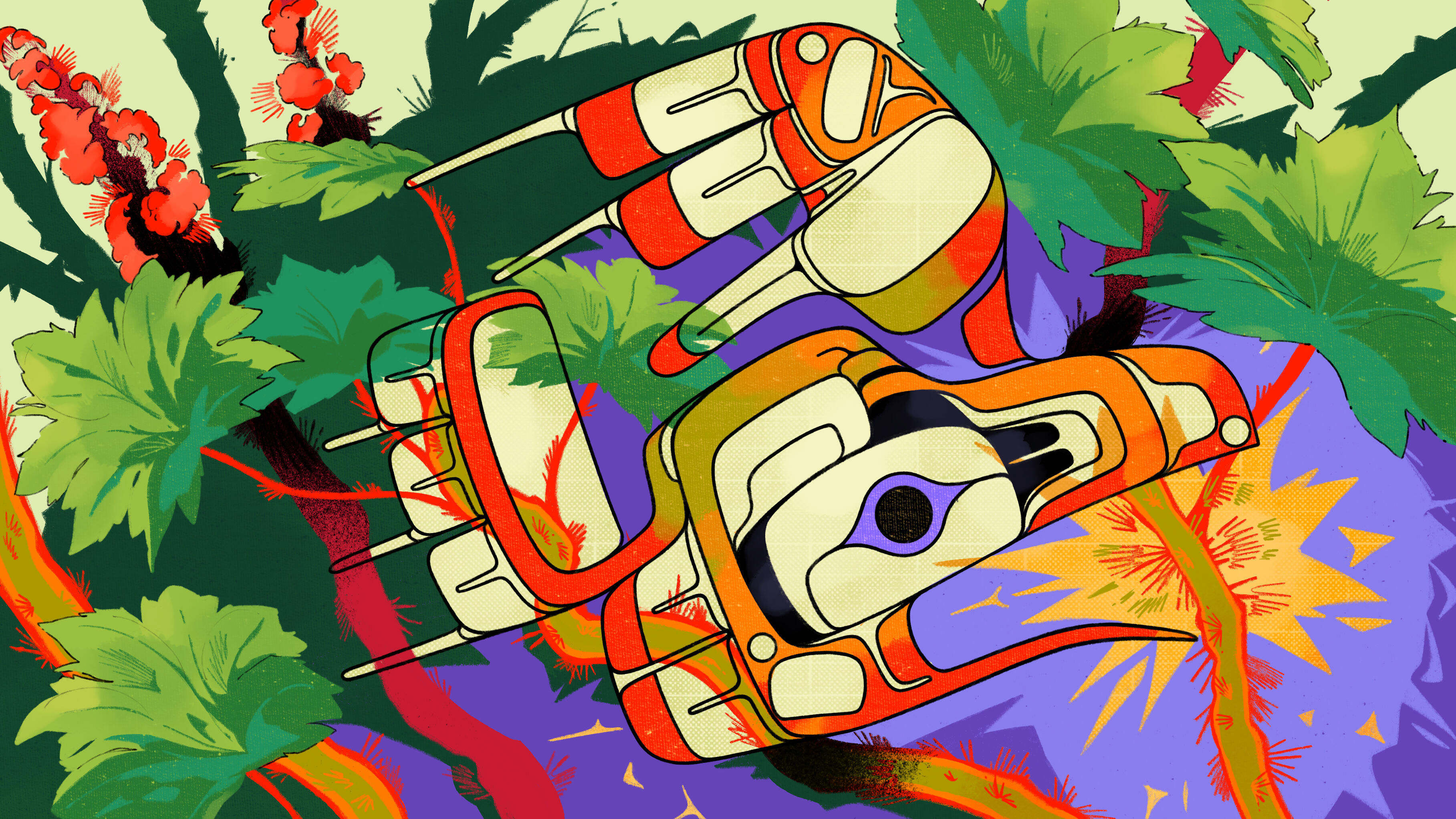 4. Txaamsm ada 'Wooms, September 2025.A hero image illustration done for the Canadian Medical Association's website initiative, called Healthcare for Real. It's a site that hosts topical articles about Canada's healthcare system, while aiming to distinguish itself from other copywritten and AI-fed sites with poppy artist illustrations. They like a cheekier vibe for the art, so for the article on Indigenous-led healthcare, I went with Raven pricking himself on the thorns of a Devil's club stem, which are harvested for medicine by us Tsimshians and neighbouring nations.