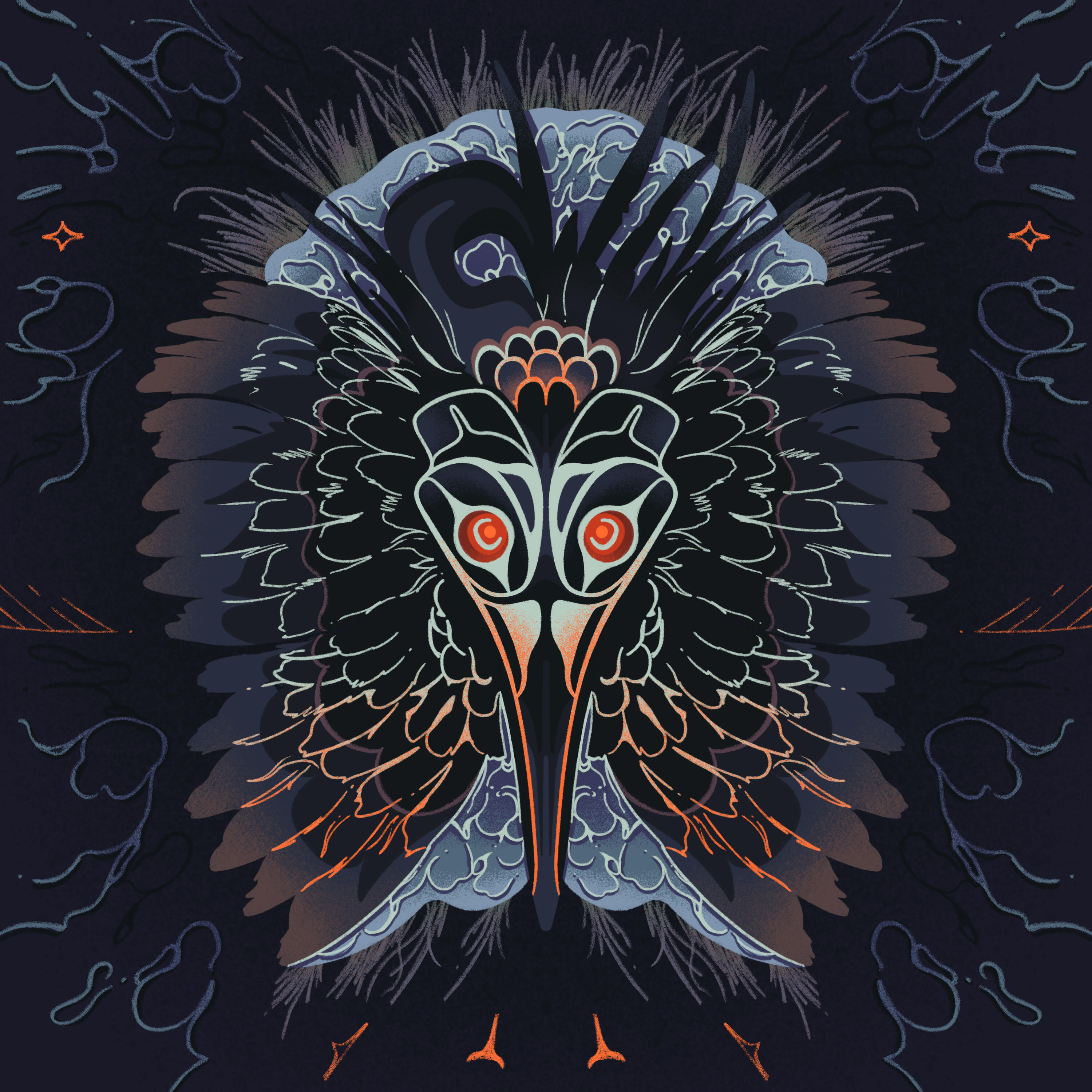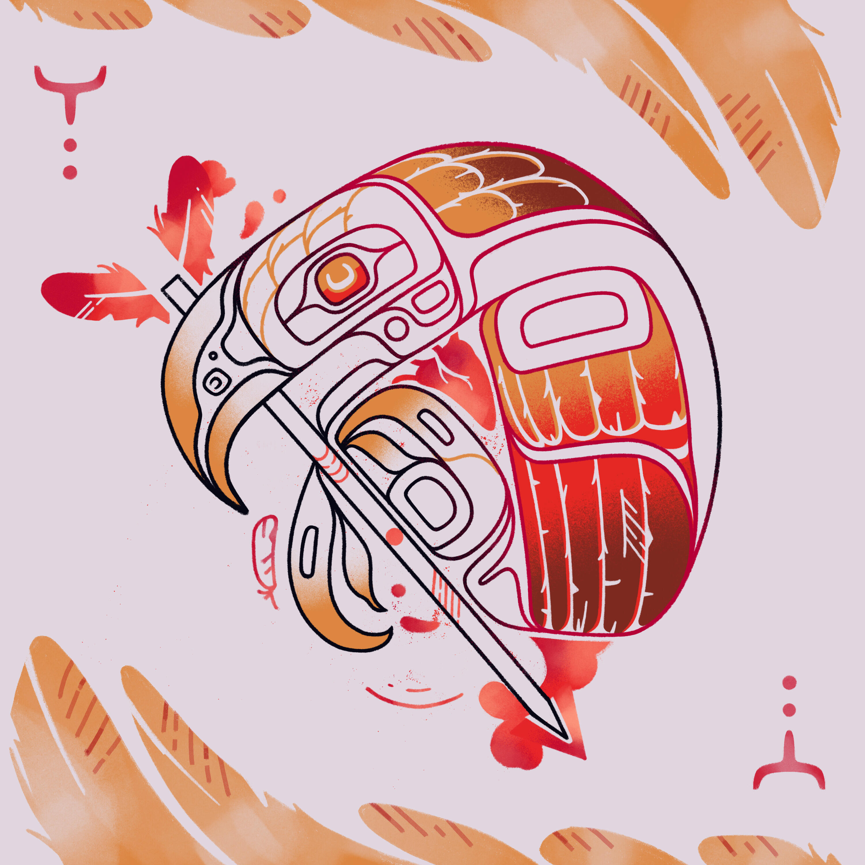 7. This Heart Is For The Wrecking, January 2024. — (Buy print)A piece loosely inspired by personal happenings and a Son Lux song I was listening to a lot at the time, a lyric of which also being the title. The song itself is a beautiful, heart-wrenching work; it opens with drums in a slow rhythm, echoing as if in a vast space, and crescendos with a suite of tragic strings and the Son Lux trademark distorted vocals. It really pulled at a feeling I was nursing at the time of having an exhausted heart, desperate for confession and reprieve.8. Amt'aa, June 2024. — (Buy print)Amt'aa is Sm'algya̱x for "loon". I'm not certain whether this is the actual etymology, but it also seems to break down into aam, meaning "good", and t'aa, "sit", as if evoking the way they sit calmly on the water. In the first half of 2024, some ongoing gastrointestinal problems I was having became unbearably worse nearly overnight. I'd already had to restrict my diet for years - now, I could barely eat anything. I had a small artistic fixation on loons at this time, I think because I felt jealous. I was jealous of having that sense of tranquility in your body, especially when eating what you want. This work shows the reflection of a loon in the water as it catches a minnow; droplets from the action cause ripples in the water, disturbing the reflection to show two more minnows, circling each other beneath the surface in the loon's general abdominal area.9. Eclipse, April 2024.A neat piece I did to commemorate the 2024 North American eclipse, with a wolf emblazoned on the moon. I just think they're neat.10. The Salmon Runs, the Loon Rests, May 2024. — (Buy print)Another loon artwork. I like contrasting two different animals in formline, I suppose, and with this one I wanted to contrast the amt'aa, or "sitting well" of the loon with the "run" of the salmon. I made the salmon part of the design more complex and cramped, while the loon's half is simpler and has more room to breathe.11. Metxa̱laalt ada Stukwliin, March 2024. — (Buy print)The title translates from Sm'algya̱x to "the snake and the rabbit" in English. After my Paintillio mural, I wanted to make another snake formline design and do something weird stylistically with it. I like how the rabbit in the inside of the design turned out with the ballpoint pen texture.12. An Impossible Feeling, November 2024. — (Buy print)In the midst of some therapeutic processing this year, I would sometimes experience an old emotion or state of mind "pass through" me, while not being able to understand completely what it was or see through all of it at once. It was a very physiological experience, as if a 4D shape was moving over me, tearing my model a little bit like I was a buggy video game character. Sometimes I would get glimpses into little thoughts that brought me clarity about my mental state, but I could only ever see restricted parts of the overall tesseract. I also love servals and had never drawn one before. I thought their markings would compliment the surrealist nature of the art well. I included a trail cam backdrop for the head of the serval to capture the slight paranoid feeling I had whenever this experience cropped up.13. Pursuit of the Nucleus, July 2024. — (Buy print)Raven steals the sun, yet again. This time with a new semi-realistic flare, a chopped-up composition, and an air of desperation; pursuit of anything at the cost of everything.14. Wilaayu Naat 'Nüüyu, October 2024. — (Buy print)A Sm'algya̱x title that translates to "I know who I am". The title comes from a Tsimshian song shared by one of my language mentors, about knowing who we come from and having strength in ourselves. An anthropomorphic wolf, a stand-in for myself, is surrounded by a colourful aura that represents her spirit. In her torso is a relief design of Eagle, which is my Tsimshian clan crest.15. C(erberus)-PTSD, November 2024. — (Buy print)A piece I'd been working on for a couple months, at this point. I was inspired by my own name, cerb, and experiences I'd had throughout the year making space for emotions from the younger parts of my life to be released from hypervigilance and back into my heart. The cerberus that guards the heart finally opens it to re-integration. I liked the idea of using thick lines to create a stylistic contrast with the little wolves, to emphasize their smallness and establish them as feeling "out-of-place".