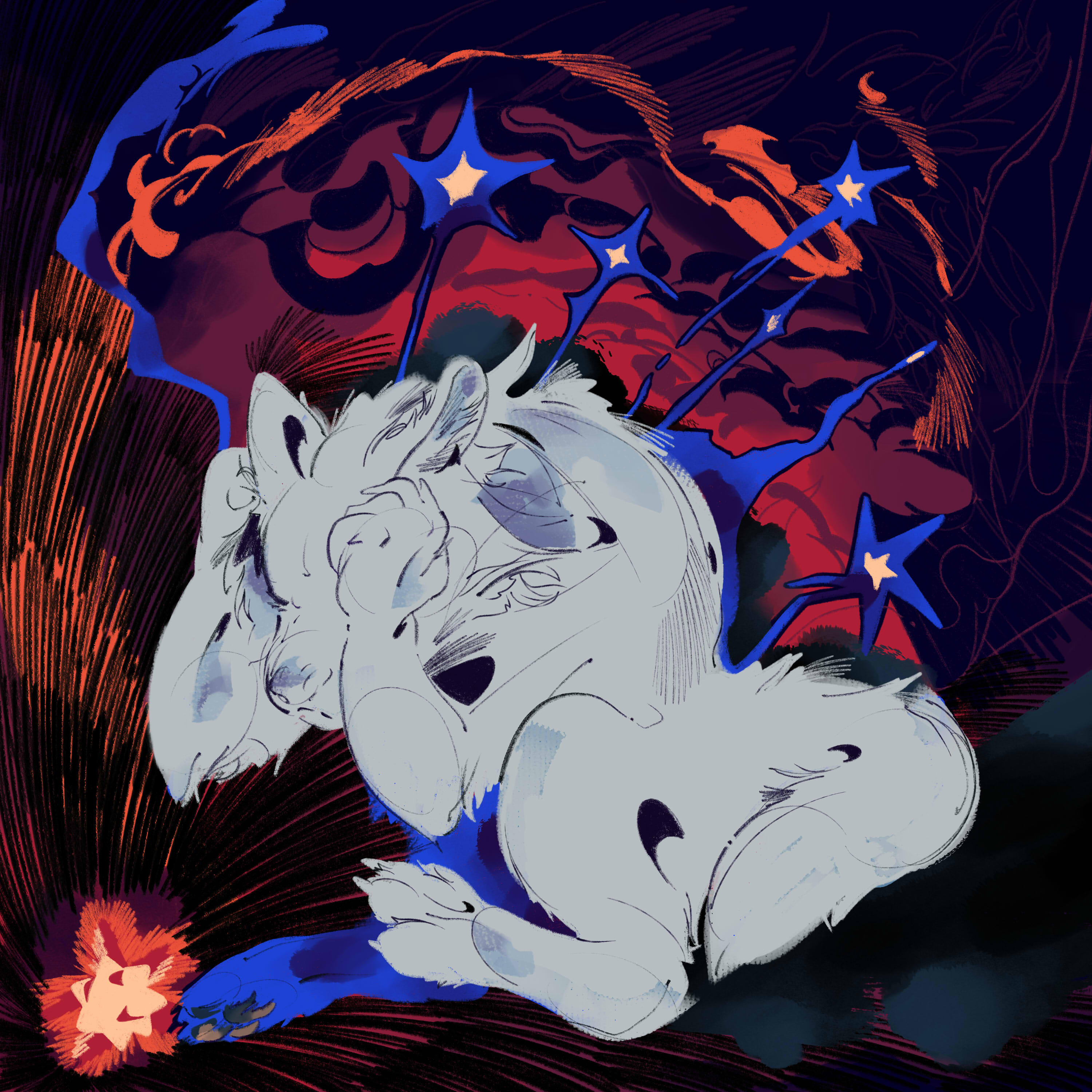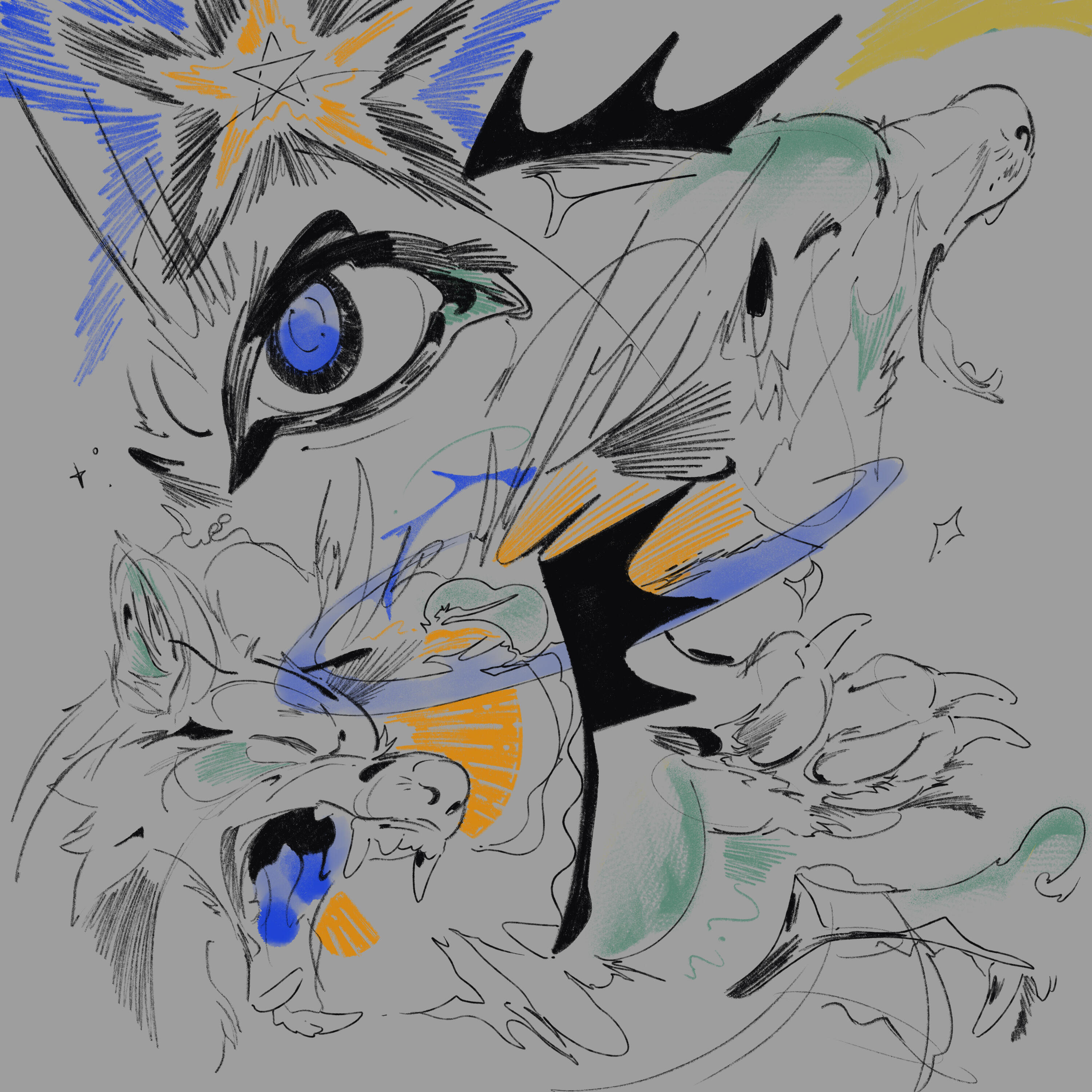 A sketchier one that popped into my mind along with the phrase. Combining animal imagery with odd snippets about identity is a tried-and-true tradition of mine.7. Only the Stars Satiate, September 2023. — (Buy print)